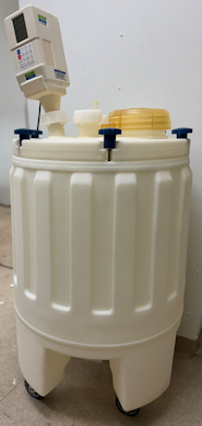 Nalgene 200 litre mixing tank in polypropylene. Integrated stirrer unit (220 V) 0-100 rpm. Conical bottom for low dead volume and bottom valve in teflon. TC connections.